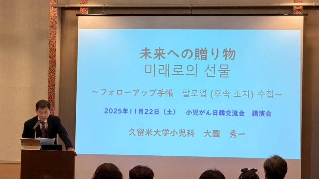 小児がん患者及び家族の日韓交流会が開催されました。 2025 11/28 お知らせ 2025年11月28日 小児がん患者及び家族の日韓交流会が11月22日~24日まで福岡県久留米市にて開催されました。 大園先生(久留米大学小児科准教授)が小児がんのお話をして下さり、その後韓国と日本の小児がん経験者が発表。 お互い交流を深めました。 お知らせ URLをコピーしました! 第67回日本小児血液・がん学会開催 第一生命保険株式会社様よりご寄付を頂きました